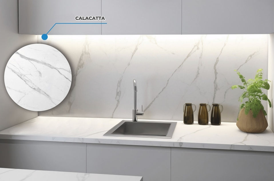 A Calcatta PVC panel tökéletesen tükrözi a természetes márványhatást. Kiváló választás nagyobb felületek burkolására.
