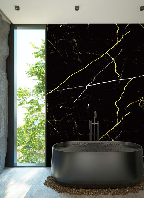 Mélyfekete alapja arany és fehér erezetekkel díszített, amelyek drámai és elegáns megjelenést biztosítanak, tökéletesen illeszkedve a prémium enteriőrökhöz.